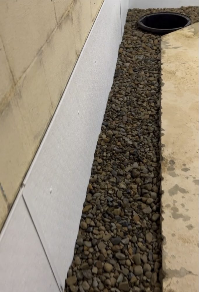 We install 4″ rigid PVC piping along the exterior walls paired with moisture barrier to allow water into the system instead of in your walls causing hydrostatic pressure.